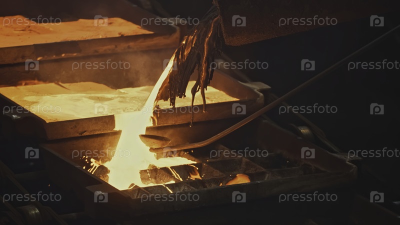 Потоки горячего металла заполняют формы на фабрике. Снимок запаса. Красивый расплавленный металл вливается в формы. Поток металла на металлургическом заводе