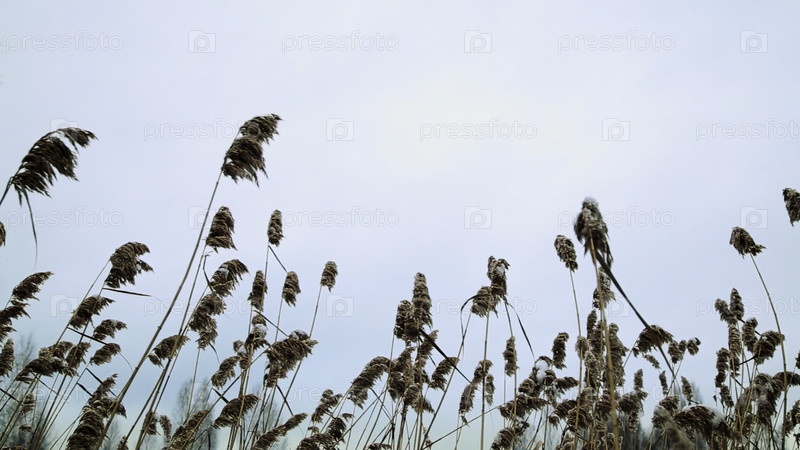 Спокойный и спокойный пейзаж, демонстрирующий золотые тростники, мягко раскачивающиеся в нежном порыве ветра под красивым чистым небом