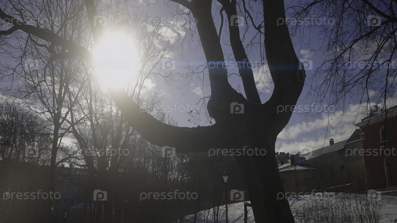Дерево в парке на фоне яркое солнце зимнего дня. Действие. ствол дерева с яркими лучами солнца зимним днем. Солнце сияет ярко за голым деревом в зимнем парке