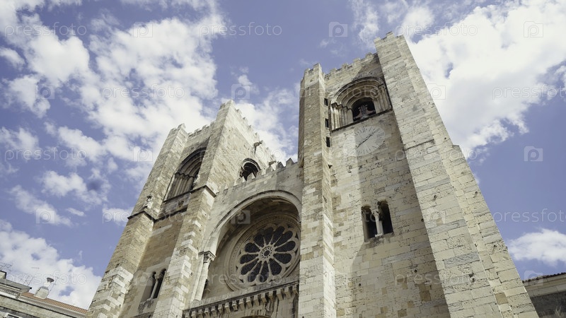 Лиссабонский собор в летний день. действие. низкоугольный вид красивого древнего здания на фоне голубого облачного неба