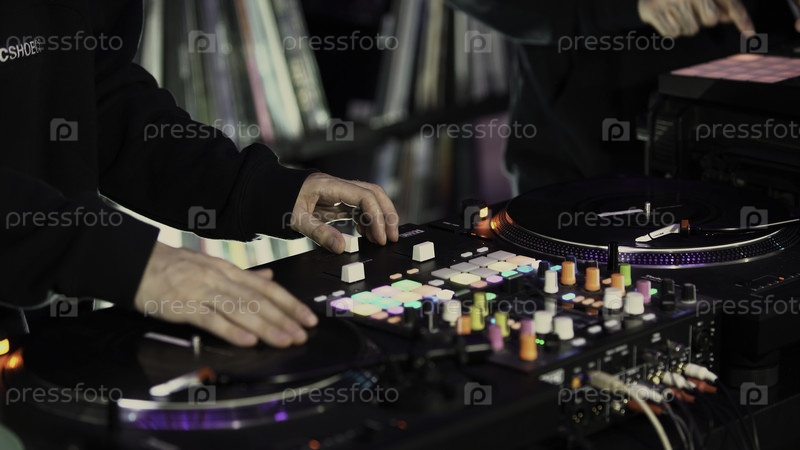 Близкий снимок мужских рук, вращающих кнопки на профессиональной диджейской миксерной консоли
