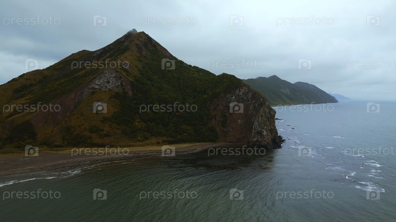 Вид сверху потрясающего пейзажа горного побережья в пасмурный день. Клип. Кинематический ландшафт побережья со скалистыми зелеными горами. Красивое море у берегов горного северного острова