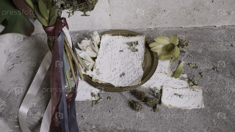 Закрытие мемориального букета цветов и тарелки с надписью на земле.Действие.Концепция памяти и чести