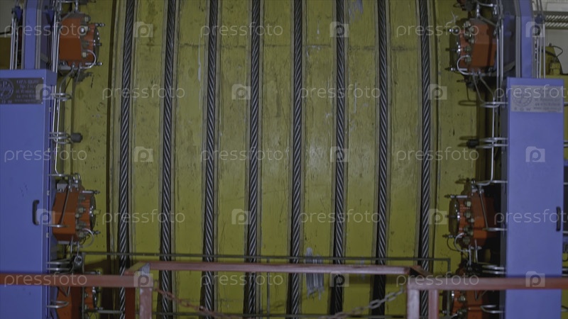 Механизм с веревками для шахт. Застежка. Барабан лебедки системы подъема шахты в производстве. Несколько веревок на барабане для системы подъема шахты