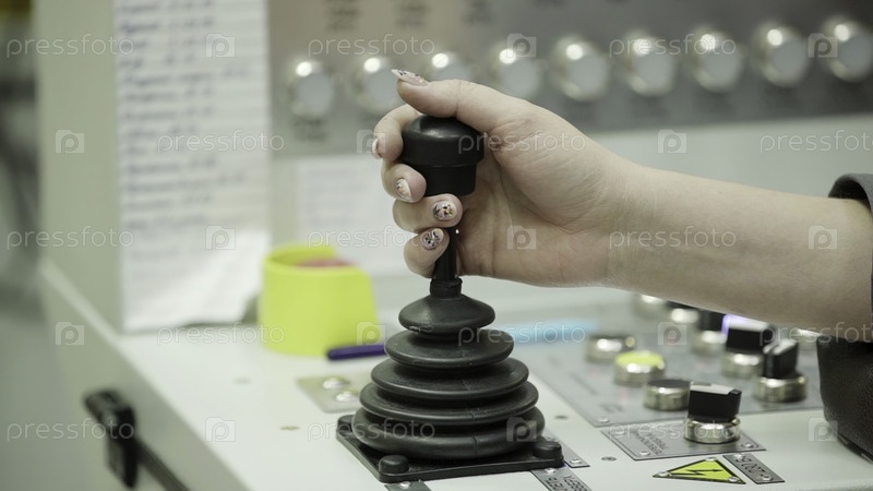 Человеческая рука умело манипулирует промышленным джойстиком, эффективно иллюстрируя управление в сложных машинах