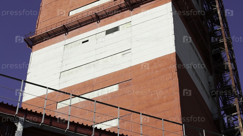 Высокий промышленный дымоход с смелой красно-белой цветовой гаммой на фоне чистого синего неба
