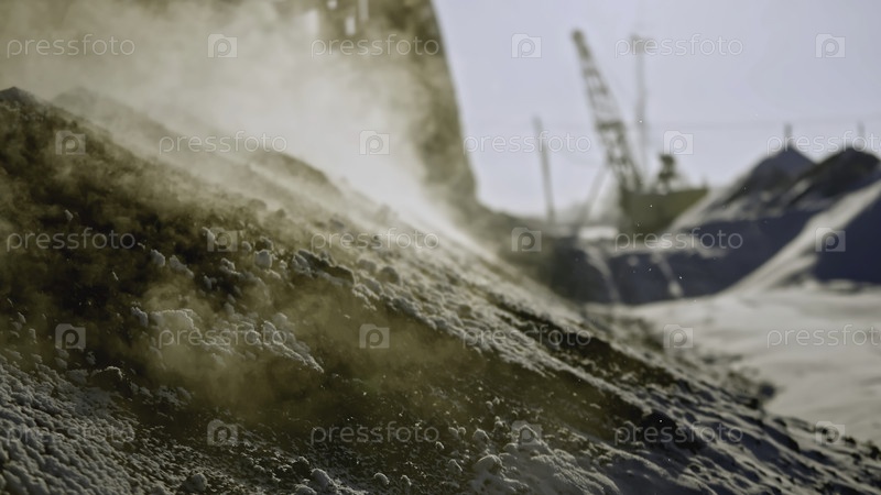 Добыча руды зимой. Снимок запасов. Близкий план горячего ископаемого, выделяющего пар на поверхности земли. Извлеченная куча минералов выделяет пар в зимний день в карьере