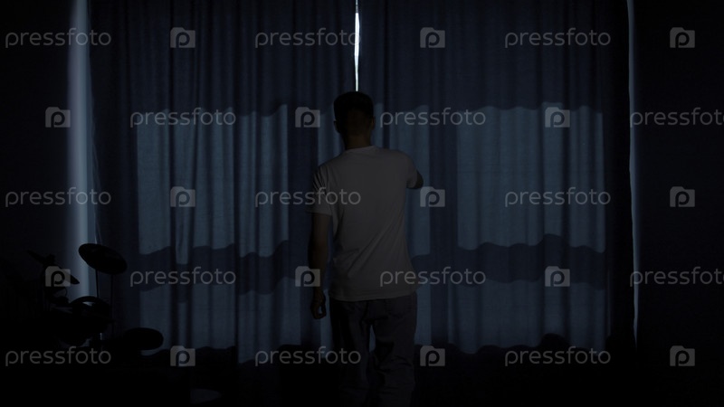 Силуэт мужчины, открывающего шторы и смотрящего в окно утром, концепция начала дня СМИ Молодой человек растягивается и смотрит через окно