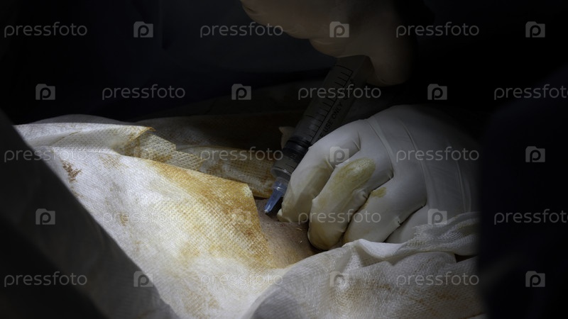 Вставка иглы под кожу тела пациента. Действие. Близкий снимок хирурга в перчатках, делающего инъекцию