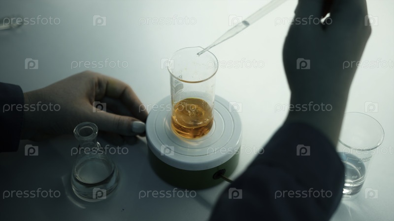 Научный или медицинский лабораторный исследовательский тест в лаборатории. Запасные кадры. Смесь в колбе
