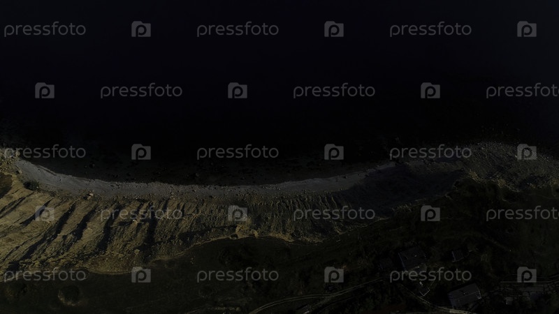 Вид с воздуха на береговую линию озера с темно-синей поверхностью воды.Снимок.Вид снизу вверх по зеленой изогнутой долине и берегу озера