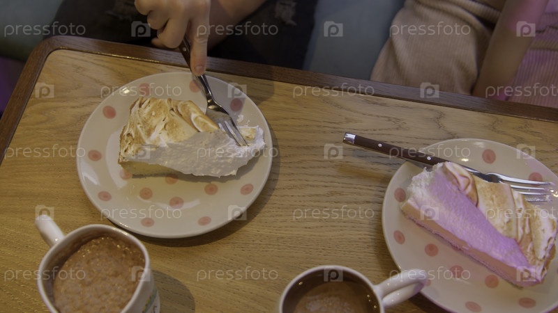 Вид сверху девушки, которая ест пирог из меренге в ресторане