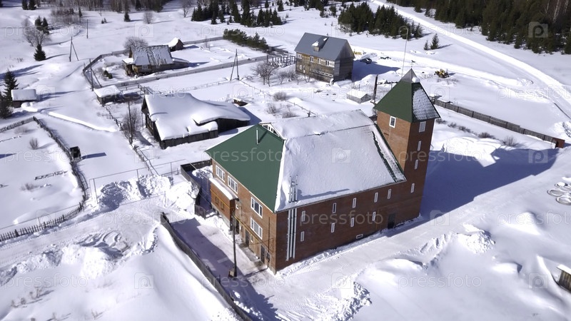 Вид сверху небольшой деревни с коттеджами зимой.Клип.Маленькая деревня в лесистой местности в солнечный зимний день.Удаленная деревня с большим кирпичным домом