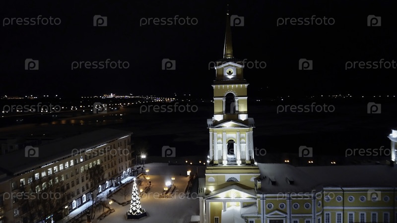 Вид с воздуха на освещенную церковь и жилые здания.Клип.Прекрасный город ночью
