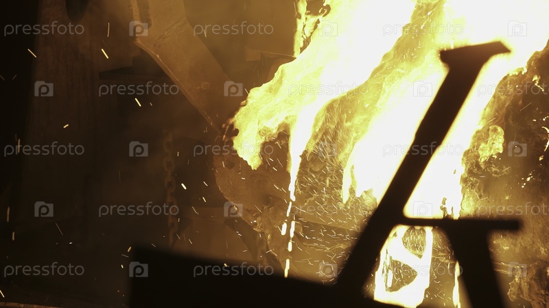 В металлообрабатывающей мастерской разворачивается увлекательная сцена с яркими искрами, летящими вокруг горячей светящейся печи