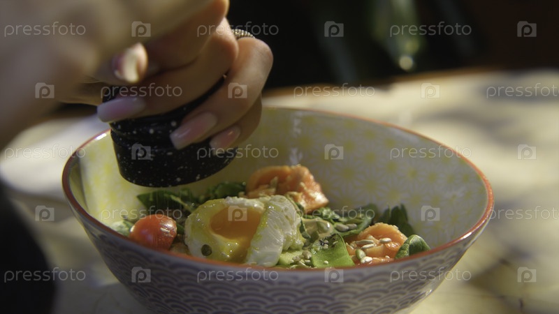 Ближайший снимок женщины, добавляющей специи в салат. Скриншоты из запасов. Салат женского перца с яйцом. Сердечный приправленный салат или миска с красивой порцией