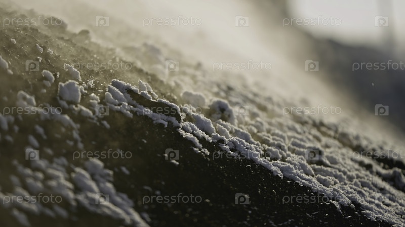 Добыча руды зимой. Снимок запасов. Близкий план горячего ископаемого, выделяющего пар на поверхности земли. Извлеченная куча минералов выделяет пар в зимний день в карьере
