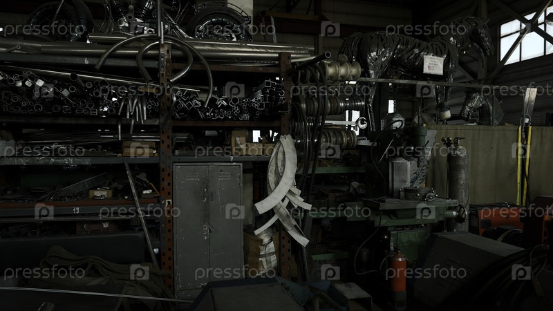 Интерьер мастерской по производству металлов.Креативность.Промышленный фон, вид изнутри фабрики