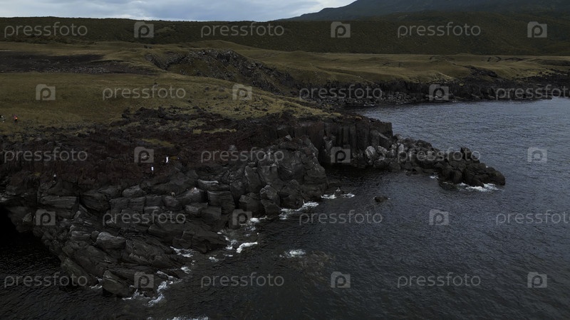 Вид с воздуха на живописную скалу и лазурное море.Клип.Зеленая трава и каменистый берег