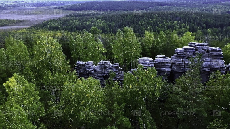 Вид с воздуха скальных обрывов среди зеленых летних деревьев