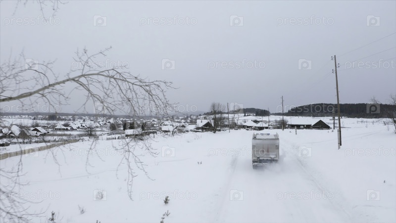 Вид сверху ландшафта водителя грузовика в деревне зимой. Клип. Грузовик едет в старую деревню в пасмурный зимний день. Красивый пейзаж зимней деревни