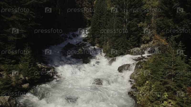 Красивая пузыряющаяся горная река с зеленым лесом. Креативное. Прекрасный горный пейзаж с густым лесом и пузыряющейся рекой. Чистая горная река с быстрым течением кипит в лесу в солнечный день