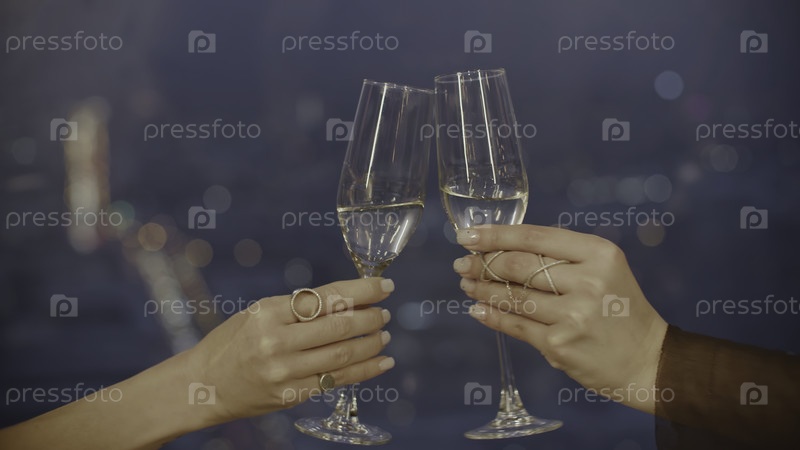 Близкий план двух женских рук, стучащих бокалы с шампанским.СМИ. Красивые женские руки стучат шампанское. Женщины стучат бокалы с шампанским в дорогостоящем ресторане