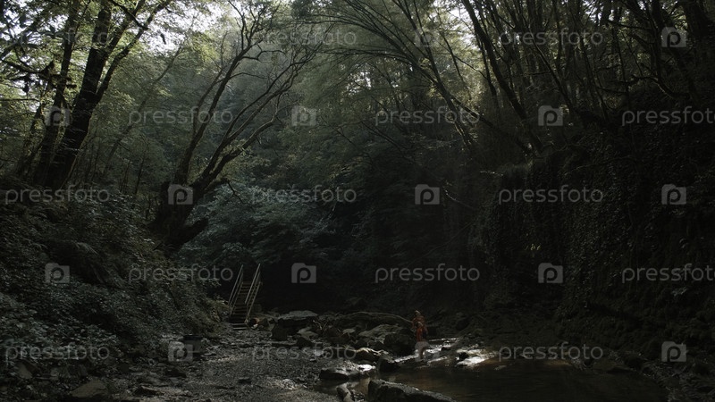 Пешеходы мать и сын, стоящие в джунглях возле холодного ручья