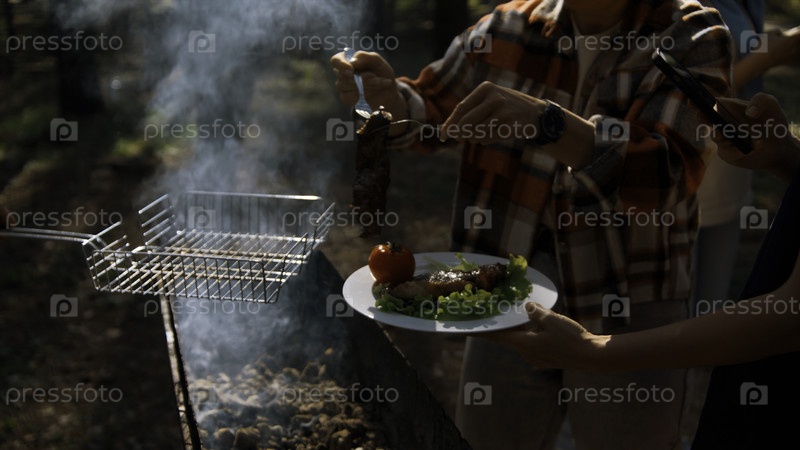 Пикник на природе в лесу барбекю у костра с дымом. запись фильма. мужчина кладет вкусную курицу в тарелку женщины с овощами