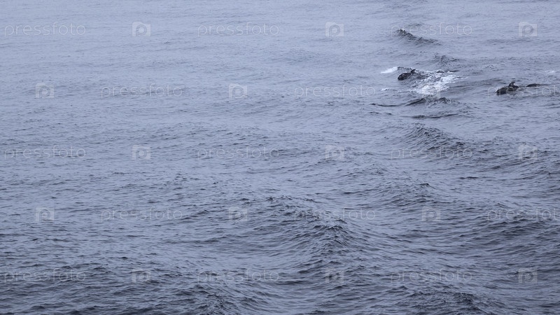 Голубое море с волнами и плавающими дельфинами. Клип. Дикие дельфины, купающиеся в открытом море при пасмурной погоде. Увлекательное зрелище плывущих дельфинов на поверхности океана