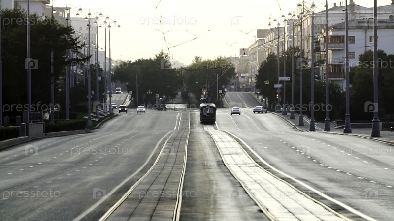 Тихая городская улица на рассвете с трамваями и красивым горизонтом в мягком утреннем свете
