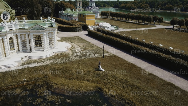 Молодожены гуляют в парке с историческими зданиями.Креативно.Вид сверху на сказочную прогулку молодоженов по усадьбе в летний день.Прекрасная территория старого поместья с садом