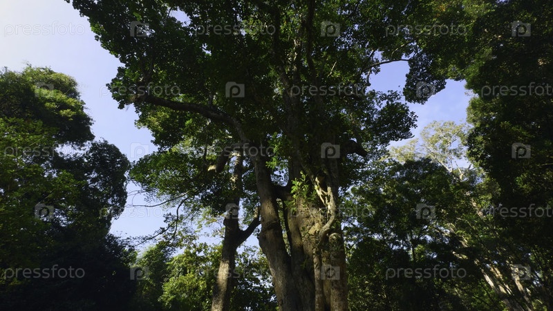 Красивые деревья в тропическом парке в солнечный день. Действие. Древесные стволы в тропическом зеленом парке в солнечный день. Хорошо ухоженный парк в тропическом климате