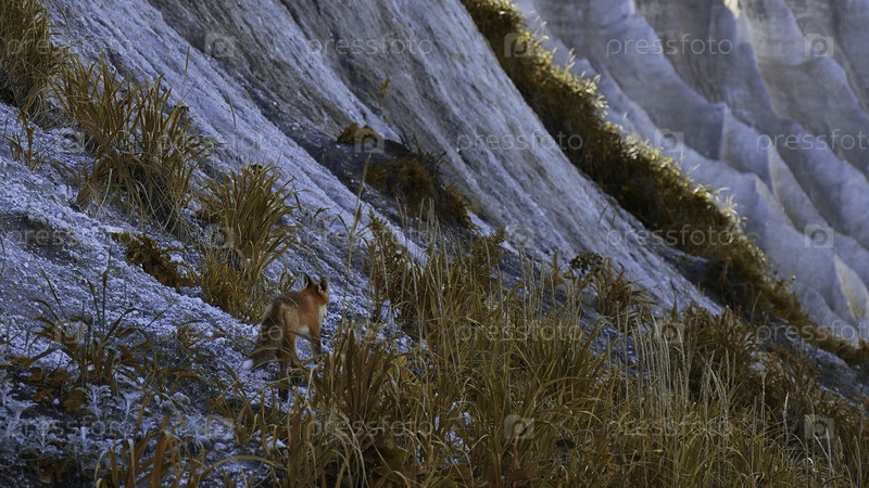 Красивая красная лиса с добычей в осенней траве. Клип. Лиса взяла пищу во рту и забрала ее. Дикая лиса охотится на окружающую среду с осенней травой на скалистом склоне