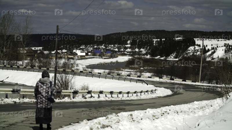Красиво спокойная зимняя сцена с женщиной, стоящей мирно возле заснеженной сельской дороги