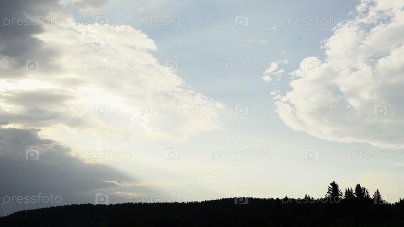 Силуэт леса и облака, текущие над ним.СМИ. Потрясающее синее туманное небо