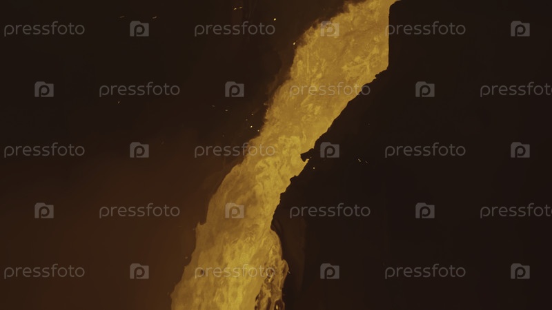 Движущийся поток расплавленного металла. Скриншоты из фильма. Расплавленный металл или лава движется в русле реки. Поток горячей жидкости с брызгами
