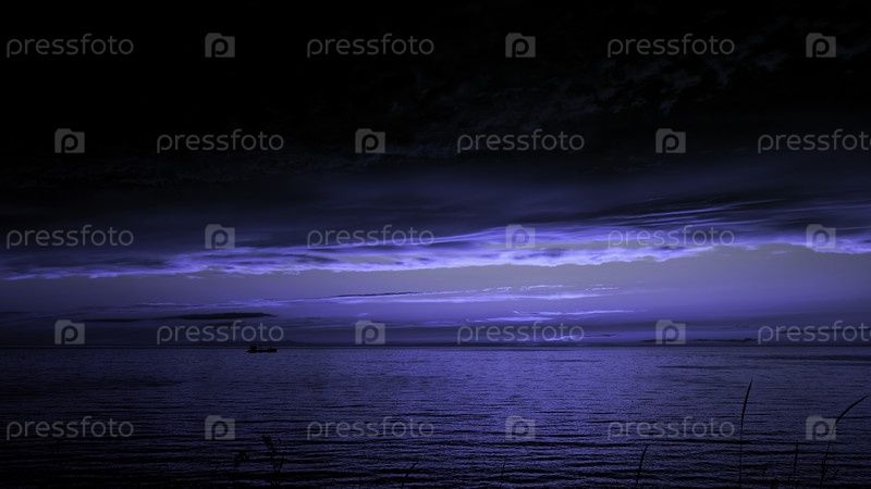 Сказочный захватывающий ночной пейзаж реки с плавучей лодкой. клип. темно-синее небо и лунный свет, тяжелые облака над водой