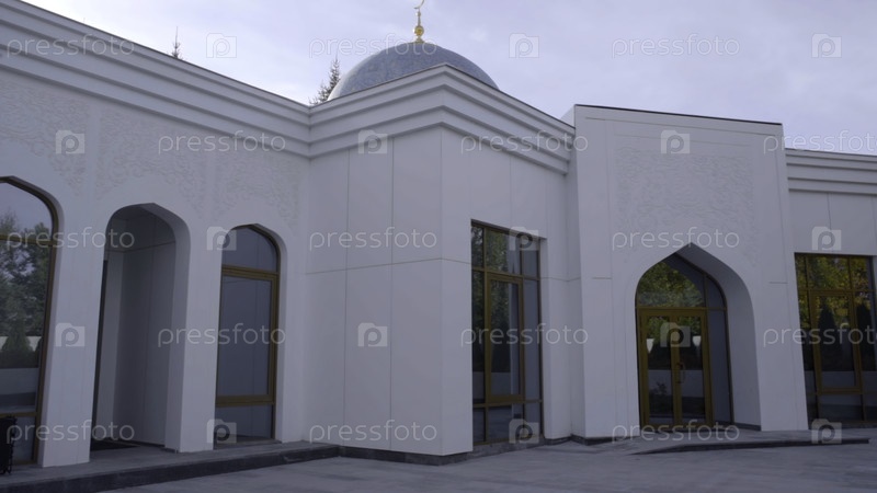 Экстерьер белой мечети, концепция религии и архитектуры. Сцена. Красивое здание с большими окнами