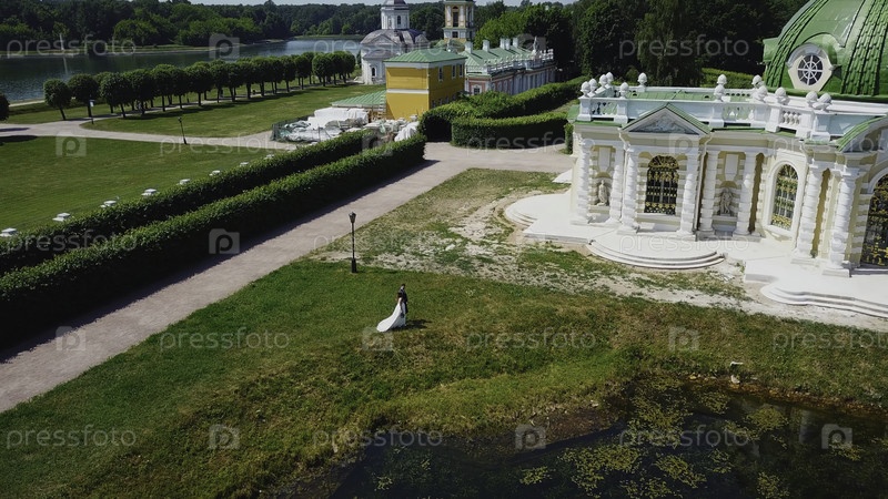 Молодожены гуляют в парке с историческими зданиями.Креативно.Вид сверху на сказочную прогулку молодоженов по усадьбе в летний день.Прекрасная территория старого поместья с садом