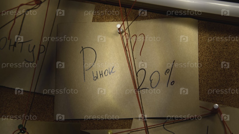 Записки с красной нитью на доске идей. Скриншоты. Близкие заметки с надписями на доске с ребусом. Загадочная черная доска со записками и красной ниткой в ночном офисе