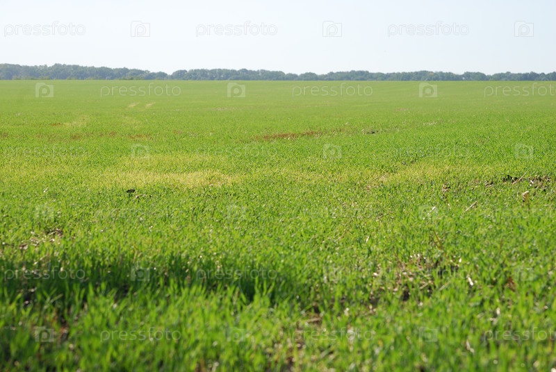 Поле с зеленой травой в Ставропольской области.Летний солнечный день, умеренные степи, широкое поле посеяно молодой зеленой травой, растения уже выросли. На расстоянии виден лесной пояс