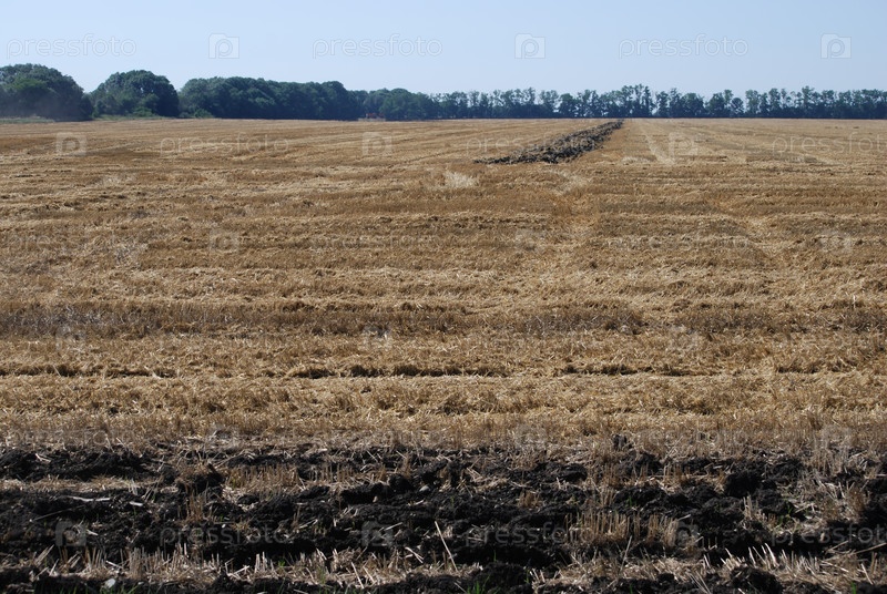Под небом поленое поле. Летний солнечный день в деревне. Широкое поле, на котором росли зерновые культуры. Желтые, засохшие, сжатые стебли растений остались на поле. Сверху светло-синее безоблачное небо