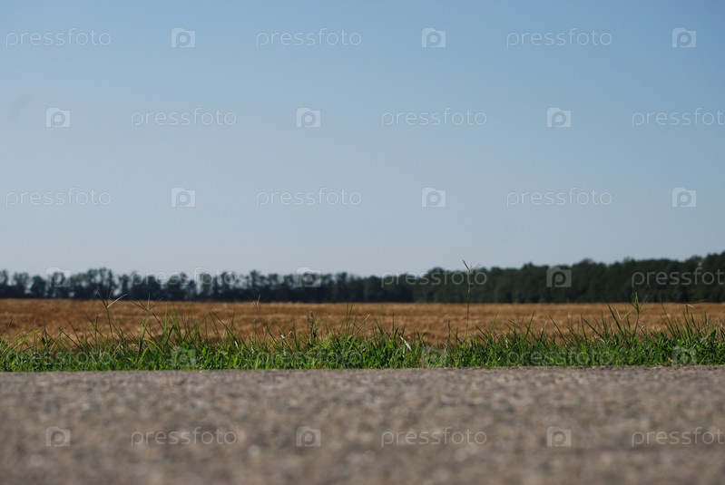 Под небом поленое поле. Летний солнечный день в деревне. Широкое поле, на котором росли зерновые культуры. Желтые, засохшие, сжатые стебли растений остались на поле. Сверху светло-синее безоблачное небо