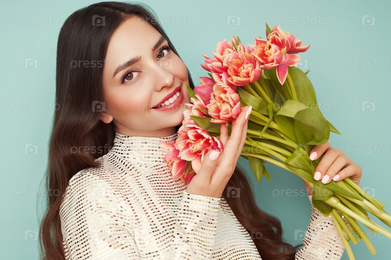 Счастливая женщина красоты с розовым букетом тюльпанов