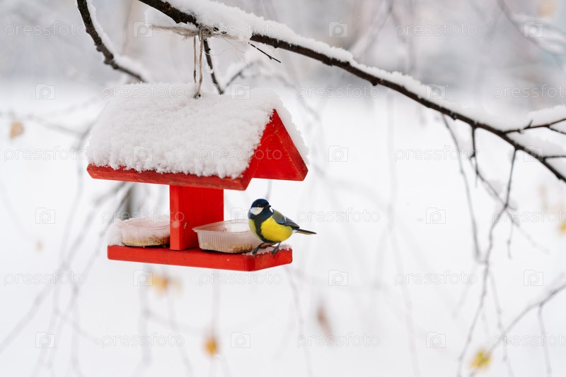 Титмаус сидит на красном птичьем кормушке