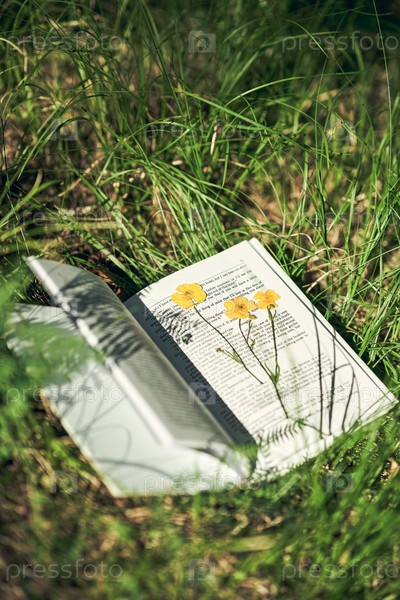 Откройте страницы книг на зеленой траве