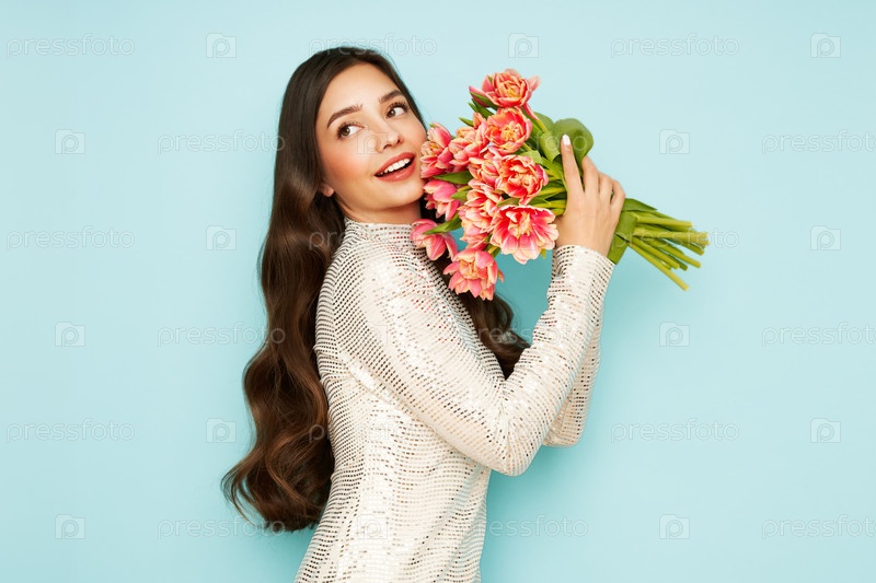 Счастливая женщина красоты с розовым букетом тюльпанов