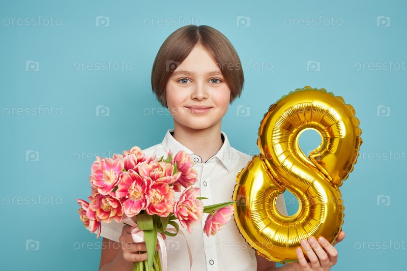 Счастливый ребенок с букетом тюльпанов и шариком номер 8