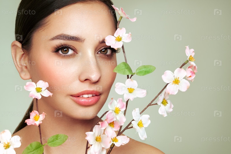 Красивая молодая женщина с ветвью вишневого цветка